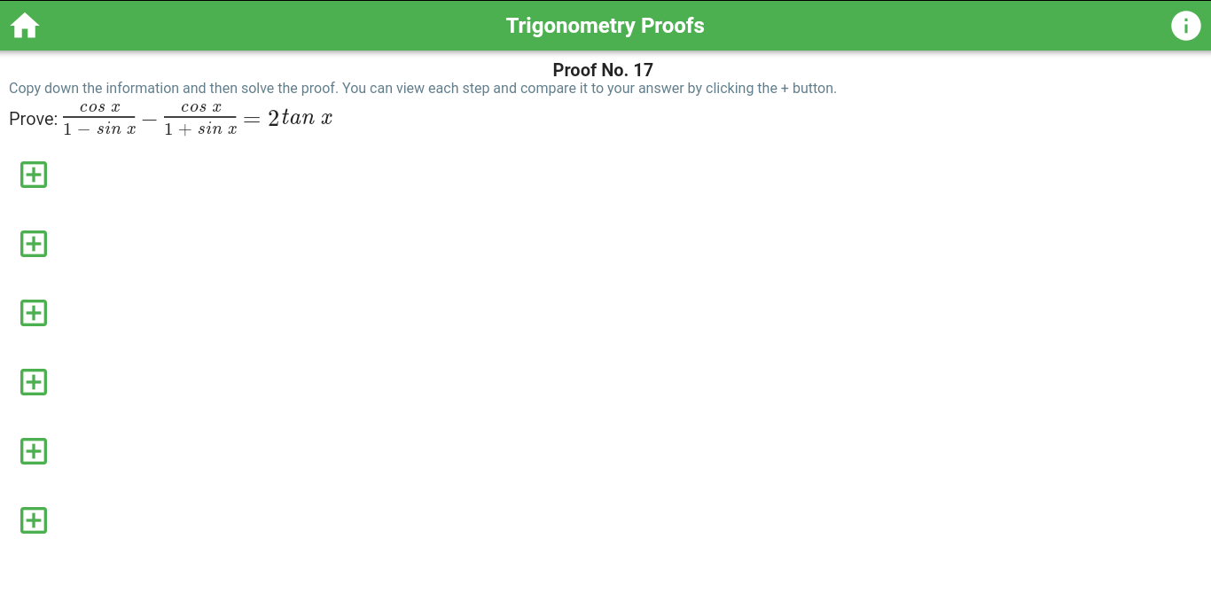 サイン、コサイン、タンジェントの世界を深く掘り下げて、数学的探求の旅に出かけましょう。自分のペースで各アイデンティティに取り組み、アプリが提供する段階的なソリューションを明らかにします。それぞれの証拠は最初は隠されているため、変換の背後にある秘密を明らかにする前に、自分の理解をテストすることができます。