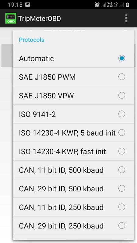 使用されるOBDプロトコルは、デフォルトでは自動選択です。接続に問題がある場合は、メニューからプロトコルを変更できます。サポートされているプロトコルがわからない場合は、すべてのプロトコルを1つずつ試してください。アプリINFOOBDを使用することもできます。これは、車がサポートするプロトコルを表示します。