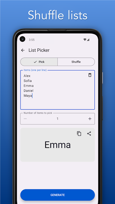 • リストピッカー:ランダムな項目を選択、またはリストをシャッフル