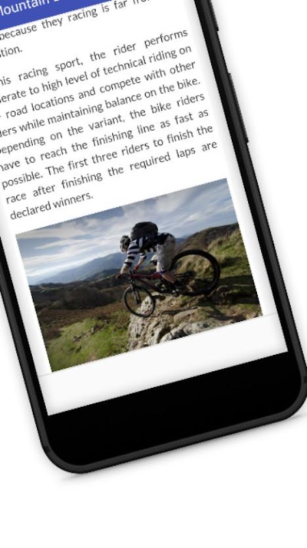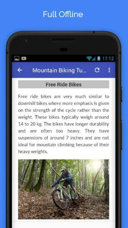 Tutorials for Mountain Biking Offline is a complete application for those of you who want to learn Mountain Biking easily and for free. There are dozens and even hundreds of Mountain Biking tutorials starting to base for beginners to advanced. All these tutorials you can read offline without the need to connect to the internet or mobile data.
