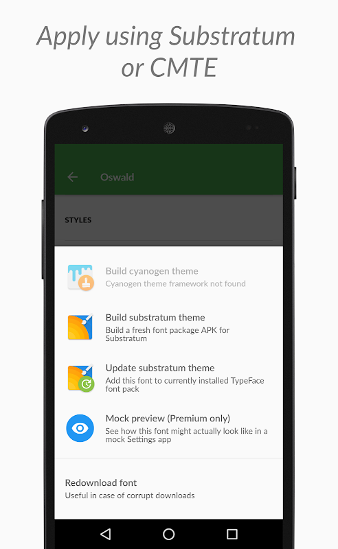 With TypeFace all Google Web Fonts are just a click away for use with Cyanogen Theme Engine or Substratum! Generate font themes on the fly by downloading fonts available on Google Fonts (http://fonts.google.com). For the power user, TypeFace also provides a premium/paid option for creating font themes by importing fonts from archives (ZIP/APK) or font files (TTF/OTF).
