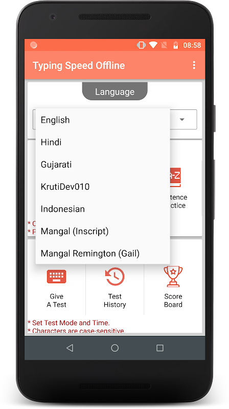 このアプリは、タイピングスピードテストアプリのオフラインで広告なしのバージョンです。タイピング速度テストアプリは、ユーザーのタイピング速度をテスト/測定するのに便利です。それはあなたがどれだけ速くタイプできるかを見つけるのに役立ちます。このアプリには、オンラインタイピングの練習を行うためのハード/ミディアム/イージータイピングなどのオプションを備えた無料のタイピングレッスンの豊富なセットがあります。入力に集中できるように、文字が強調表示されています。このアプリをさまざまな政府試験のタイピング練習アプリとして使用してください。これは、ヒンディー語/英語/グジャラート語でオンラインタイピングテストを行うのにも役立ちます。あなたはこのアプリの助けを借りてタイピングマスターになることができます、または楽しみのためにタイピングゲームをプレイすることができます。ヒンディー語とグジャラート語でのタイピングの練習もできます。その言語で入力するには、ヒンディー語とグジャラート語のキーボードを追加する必要があります。このバージョンでは、ショートカットはサポートされていません。
