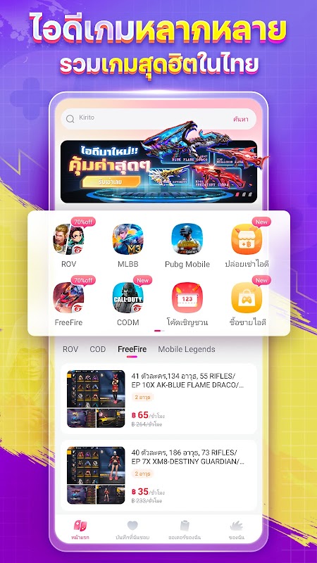 🎮 人気のゲームには、ROV Free Fire Mobile Legends Pubg などが含まれます。自分専用のゲーム アカウントでゲームに参加できるので、お気に入りのヒーローやスキンを体験できます。 🌟