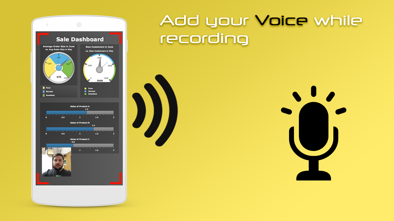 ワンタッチであなたの携帯電話の画面の映像を記録し、オーディオ、カメラのプレビュー、テキストやロゴを使用してビデオをパーソナライズします。