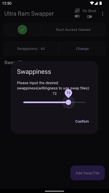 root化されたAndroidで複数のスワップファイル(仮想メモリ)を簡単に作成、有効化/無効化、削除するためのアプリケーションです。