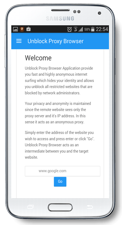 Unblock Proxy Browser is a mobile application that help you unblock blocked websites and navigate the web anonymously. Our free proxy server allow to browse the web securely knowing that your privacy is completely protected.