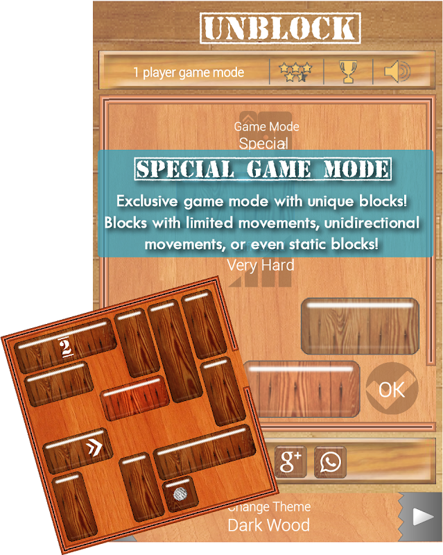 • 他のUnblockersゲームにはない「スペシャルモード」。一方向にしか動かせないブロック、回数制限のあるブロック、あるいは全く動かないブロックが登場します。まさに圧巻です!
