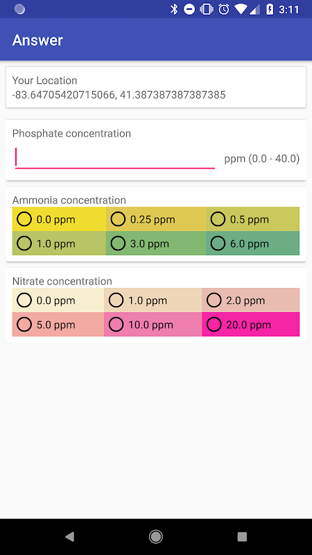 This app allows users to report the phosphate, ammonia, and nitrate concentrations at their geographical location. The submitted data can be viewed at the UndaNova website.