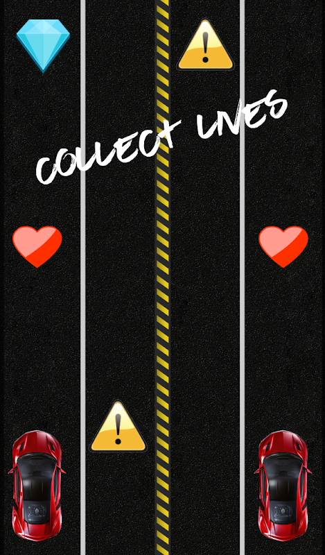 Try and dodge the warning sign as they take away 1 life, the cone 2 life’s, and the barricades take the most 5 life’s, you will have to choose what obstacle to collide with and loose the list amount of life’s, also pick as many hearts to gain life so as to keep playing. pick coins and diamonds for a high score.