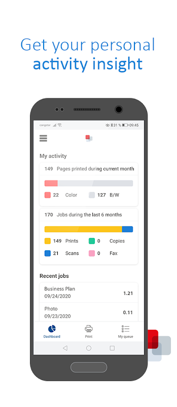 昨今、日常業務でモバイルデバイスを使う機会がますます増え、企業側でもその利点を重視しています。uniFLOW Online Print & Scanは、企業がセキュリティーを心配することなく、モバイルプリントサービスを導入するためのアプリです。本アプリを使うことで、ユーザーはAndroidスマートフォンとタブレットから、オフィスでよく使用する文書、写真や画像など、さまざまなファイルをすばやく簡単に印刷できるとともに、書類の安全性も維持されます。印刷ジョブは、ユーザー個人のセキュアプリントジョブリストに送信され、両面印刷、ホチキスどめ、パンチ穴などの出力オプションも設定可能です。会議に出席するために支社から本社に移動中でも、本アプリを使って本社のプリンターで印刷しておくことができます。ジョブリストから実行したい印刷ジョブを選択し、プリンターの画面のORコードをアプリで読み込むだけで、すぐに印刷が始まります。また、さまざまなレポートを表示するダッシュボード画面が用意されていますので、ユーザー自身のプリンターの使用履歴や、印刷ジョブリストにあるジョブなどが一目でわかります。