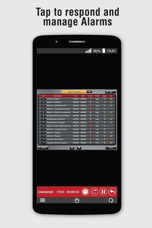 セッション中に、あなたの携帯電話の画面は赤アプリケーションバーと一緒に、PLCのHMIパネルが表示されます。