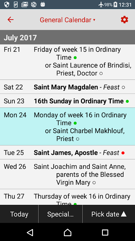 一般暦および英国、米国、オーストラリア、ニュージーランド、南アフリカ、アイルランドなどの現地の暦に基づく祝宴とお祝い。その日の聖人についての詳しい情報を提供する「今日について」ページを備えています。