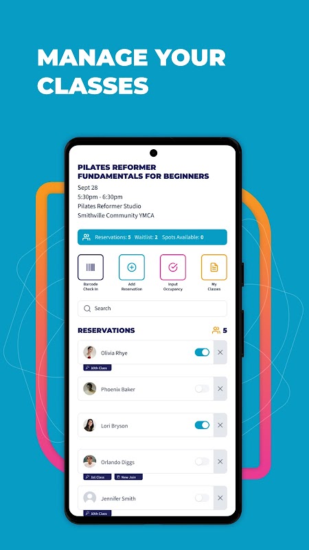 効率的なチェックイン: 到着時にメンバーを迅速にチェックインすることで、各クラスのスムーズな開始を保証します。また、各クラスの終了時にグループ演習クラスの合計占有率を入力するオプションもあります。