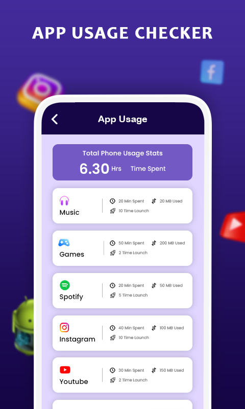 ➤デバイス上のすべてのアプリの使用状況を監視し、各アプリに費やした時間を通知するのに役立ちます。