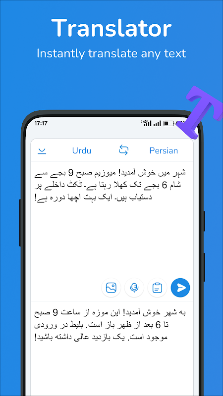 - 超高速翻訳: 複雑な段落でもウルドゥー語からペルシア語、ペルシア語からウルドゥー語に瞬時に翻訳します。