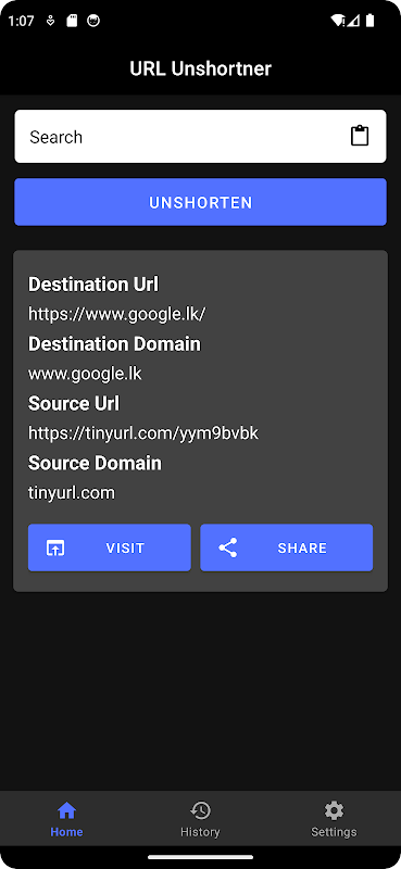 私たちのアプリは使いやすいです。短縮された URL をアプリに入力し、[短縮を解除] をタップするだけです。ボタン。その後、アプリはリンクの本当の宛先を表示します。その後、リンクにアクセスするかどうかを選択できます。