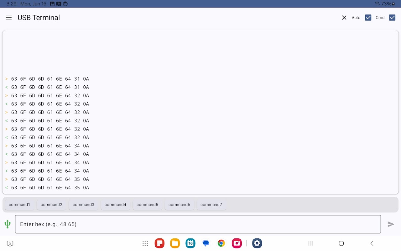 すぐにテストできるように完全なCプログラムが付属。正弦波を生成したり、コマンドをエコーしたり、センサーデータをAndroidデバイスに直接ストリーミングしたりできます。