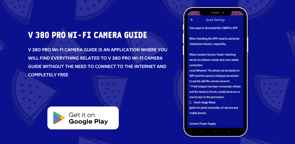 このモバイル アプリケーションは、V380 カメラに関する情報を提供するガイドです。このモバイル アプリから、デバイスの設定、V 380 カメラのセットアップ、インターネット接続後のビデオ監視、トラブルシューティングの問題、モーション検出アラームのセットアップ方法について学ぶことができます。