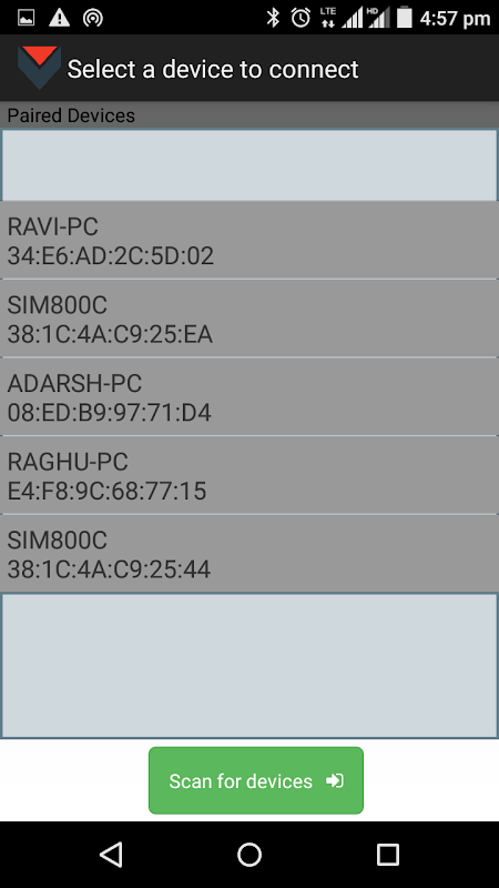 検索とアプリの画面の右上隅に存在する3つのドットボタンを使用してデバイスに接続します。そこ検索し、他のBluetoothデバイスのようなデバイスに接続します。一度アプリケーションがSIM800Cとして表示されます接続:接続されています。