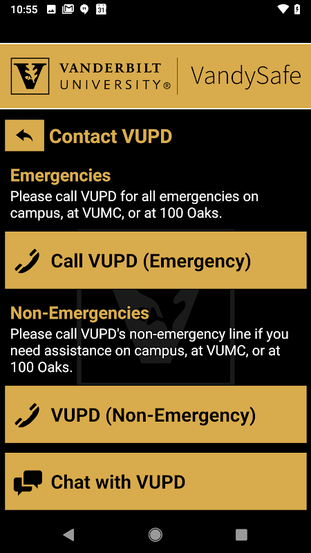 - セキュリティとのチャット:Vanderbilt Universityの安全スタッフとチャットを介してライブでコミュニケーションをとります。