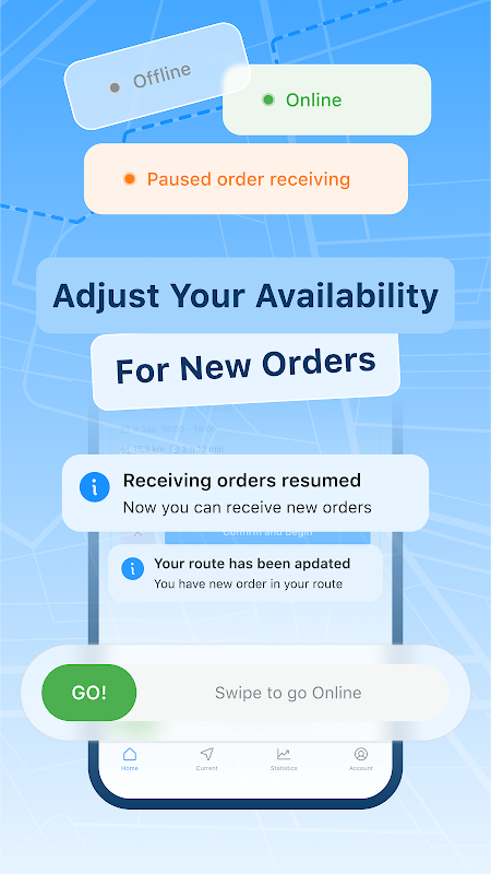当社のアプリは、高度な位置追跡テクノロジーを使用して、オンライン中に最も効率的な配送ルートを構築します。これにより、より迅速な配達が保証され、時間を節約し、より多くの収益を得ることができます。