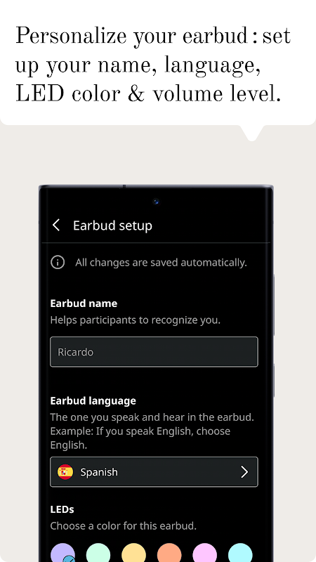 Vasco リアルタイム翻訳イヤホンをあなただけの特別なものにしましょう。各イヤフォンにパーソナライズされた名前を選択し、スタイルに合った LED カラーを選択し、好みに合わせて言語と音量レベルを調整します。これまでにない快適さとスタイルを体験してください。