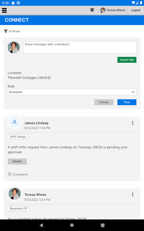 Verint WFM for Branch は、使いやすいモバイル機能により、従業員のエンゲージメントとコラボレーションを向上させます。アプリは、コア ソリューションの拡張です。ユーザーは外出先でモバイル デバイスから休暇申請を送信したり、シフトを交換して提供したり、不在時の設定を行ったりすることができます。組織内のコミュニケーションは、Connect プラットフォームを通じて容易になります。