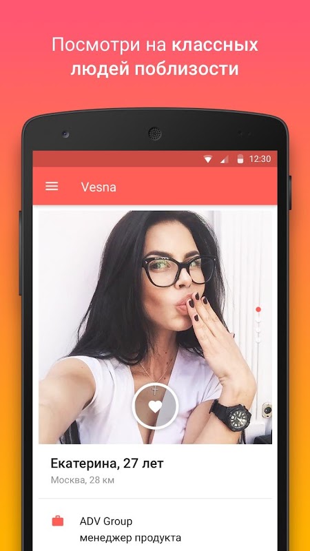 Vesna - это лучший способ найти интересных, классных людей поблизости и завязать новые знакомства и пойти на свидание. И абсолютно бесплатный. Просматривай тех, кто находится рядом и выбирай того, кто тебе нравится. Если ты тоже понравишься этому человеку, то, считайте, что ваше знакомство состоялось: общайтесь в чате и назначайте свидания.