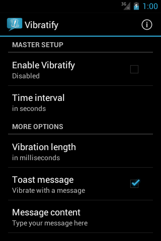 With Vibratify, you can notify yourself with vibrations of a custom length at regular time intervals. Vibratify provides a simple user interface and facilitates your need for notifications with a pop-up text message.