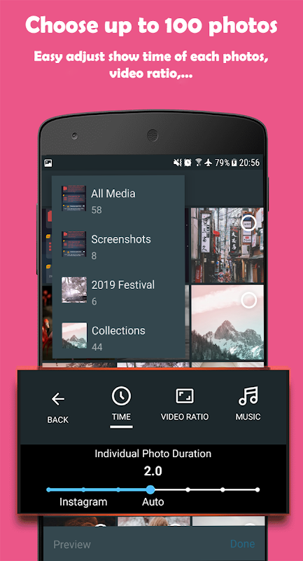 ✓写真からのプロフェッショナル編集ツール:最大100枚の写真を選択して、1つのビデオまたはスライドショーで作成します。