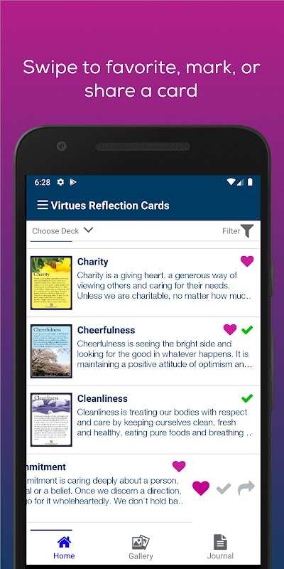 美徳カードアプリには多くのアプリケーションがあります。意思決定に使用できます。関係を強化する。価値と倫理を高める。肯定的な考え方を作成します。または単にあなたの日の前向きな焦点を提供するために。