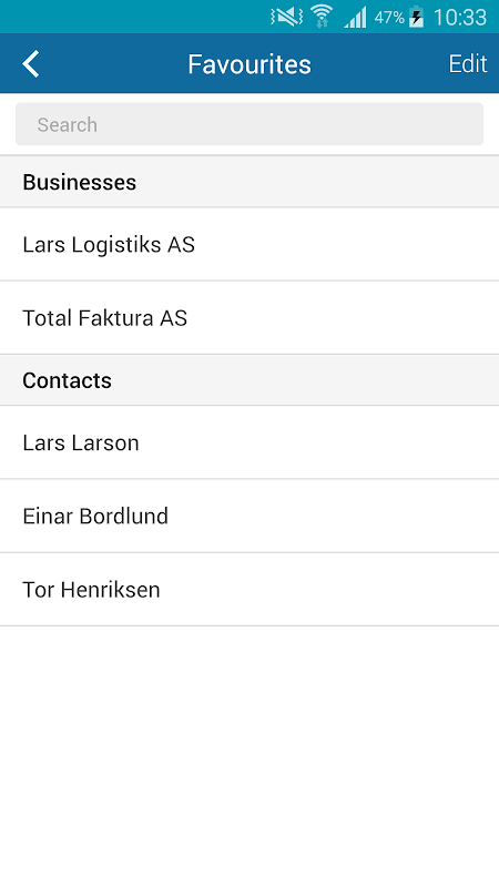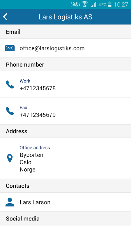 Gain access to customers, suppliers and your contacts directly from your mobile phone. With this app you can easily find contact information such as telephone numbers and addresses and with a simple tap you can call, send SMS or e-mail. You can also bookmark favorites to get faster access and look them up in social media or find the addresses on Google maps.