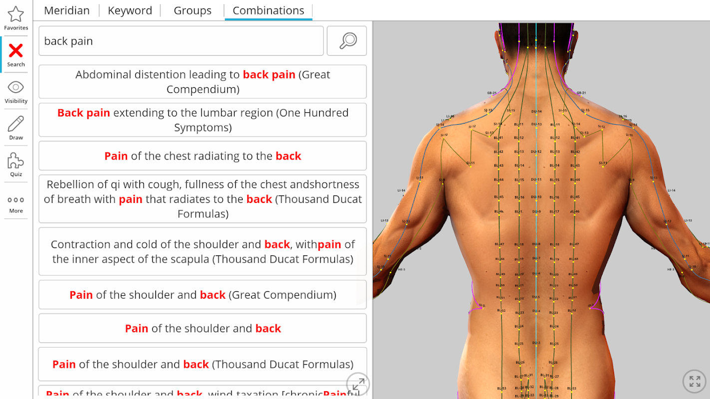拡張検索オプションが含まれています。経穴名、機能、または経穴の症状から検索します。