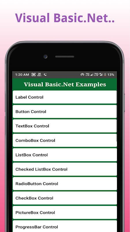 VB.NET サンプルを含む Visual Basic.NET チュートリアルは、両方の Windows フォーム アプリケーションの Visual Basic プログラミング言語を学習するのに役立つ Android アプリです。