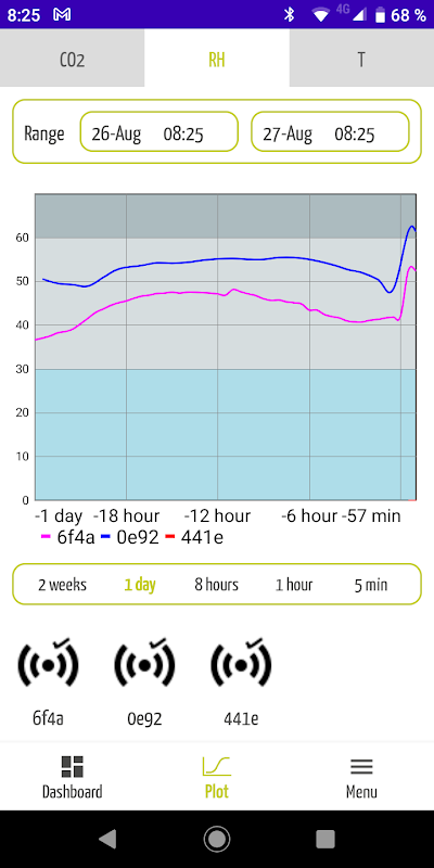 The Visual CO2 App allows the user to connect a mobile phone or the tablet to a Visual CO2 device within a list of devices present in a close area, visualize the device status, its current measured values and download saved data.