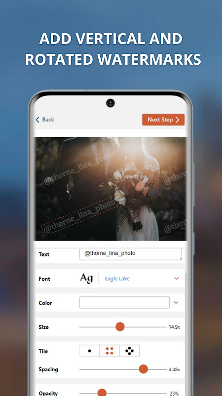 最大限の保護を得るには、写真全体に繰り返し透かしを入れることができます。それらは市松模様に配置することも、互いに平行に配置することもできます。これを行うには、「タイル」という単語の横にある 4 つのドット アイコンのいずれかをクリックします。スパン スライダーを調整して、ウォーターマーク間のスペースを変更できます。