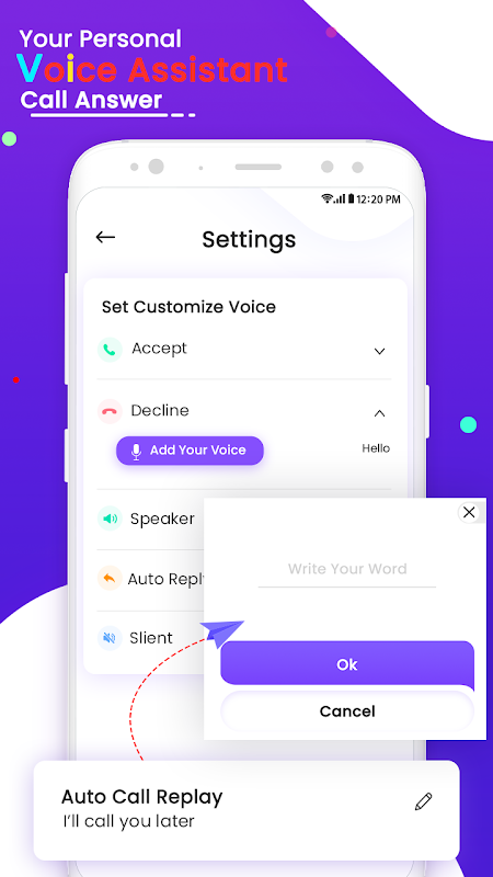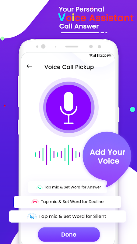 定義済みの音声コマンドを使用すると、「こんにちは」と発呼を受け入れる、「いいえ」と発呼を拒否する、「スピーカー」と発話モードで通話に応答する、「SMS」と発話して自動応答を送信するなど、通話に応答または拒否できます返信メッセージなど。さらに、「OK」、「保留」、「申し訳ありません」などの独自の単語をカスタマイズできます。これらのことは、車を運転するときに役立ちます。このアプリケーションは、麻痺した人々が音声コマンドで電話に出るのを助けるために、スピーカーフォンを単にオンにする自動受信コールをサポートしています。また、このアプリは、電話を使用して便利に電話に応答する身体能力を持たない人々を支援するため、音声を使用して回答を提供できます。