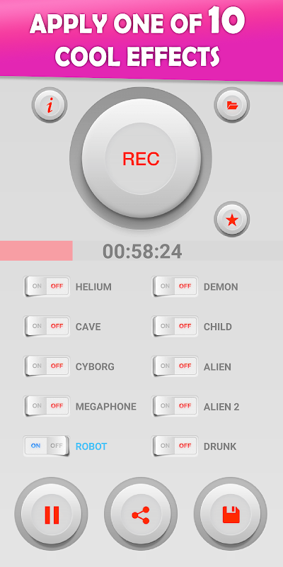 あなたの声を録音し、エイリアン、子供、または酔った効果を追加します。 お友達と共有しましょう!