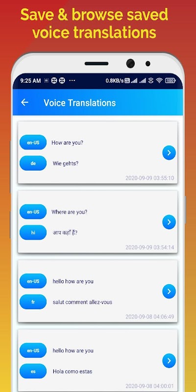 - すべての言語で翻訳された音声を録音、保存、翻訳、聴く。