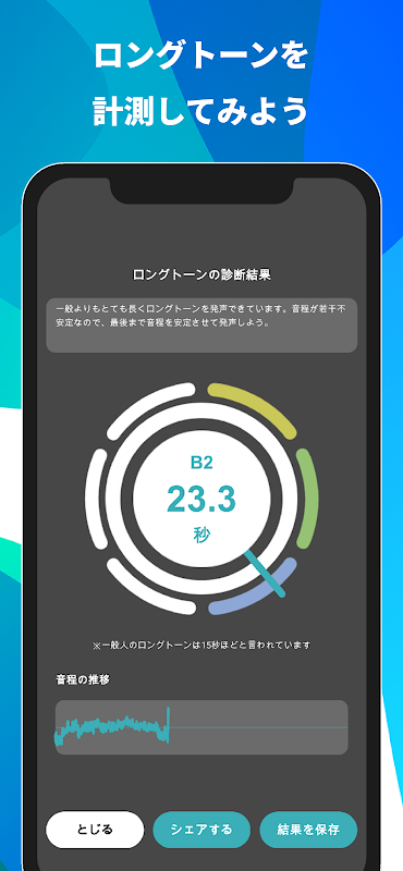 音域測定、ビブラートタイプ診断、ロングトーン診断、音程正確性診断など、様々な歌声診断機能を搭載。