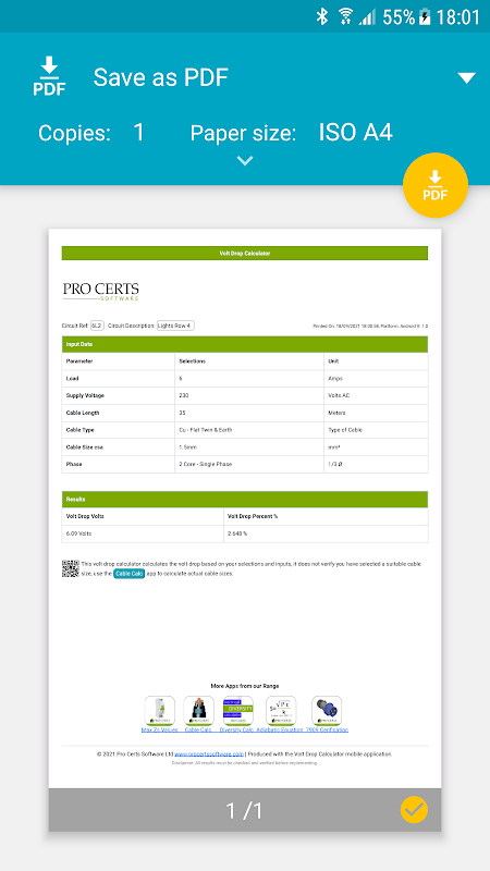 電気回路やケーブルの電圧降下を計算したり、PDFファイルとして保存したり、電圧降下の計算結果をAndroidデバイスから直接印刷したりするための電圧降下計算機。