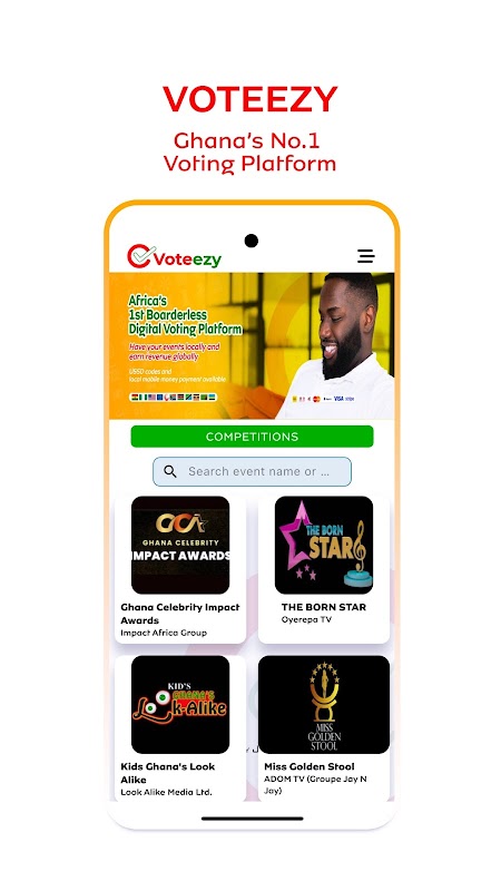 Voteezy は、ユーザーが USSD、voteezy.com Web サイト、およびモバイル アプリで投票できるマルチプラットフォームの投票システムです。