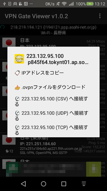 【ヒント】OpenVPN を含むサーバ情報を長押しすると、取得できるであろうポートの .ovpn ファイルを自動ダウンロードした上で OpenVPN へ引き継ぎます