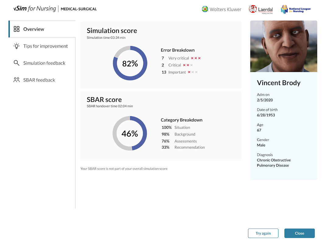 LaerdalMedicalとWoltersKluwerが共同開発したvSim®forNursingを通じて、臨床判断スキル、能力、および看護に対する自信を養います。
