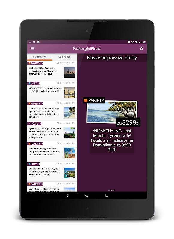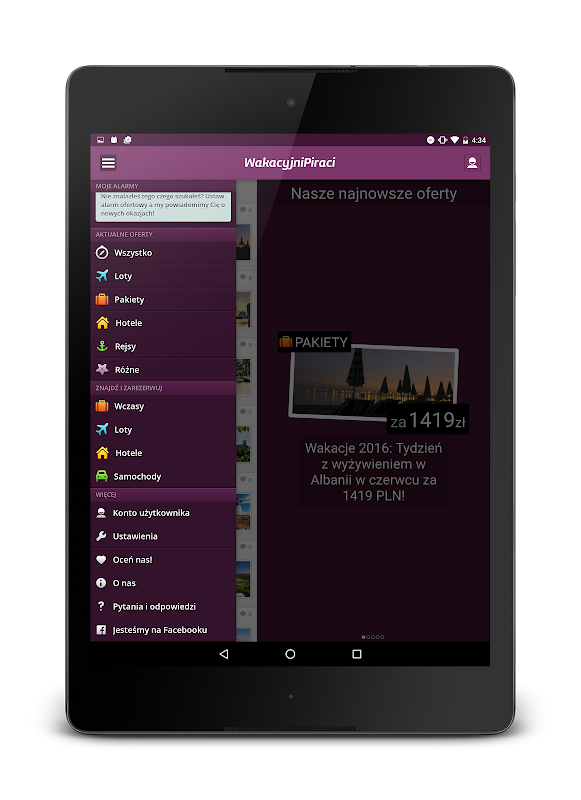 Potrzebujesz odpoczynku? Szukasz tanich ofert urlopowych, lotów, hoteli, voucherów? Mamy wszystko czego potrzebujesz! Z naszą aplikacją będziesz na bieżąco z najświeższymi ofertami Wakacyjnych Piratów. Dostarczymy Ci je bezpośrednio na Twój telefon! Ale wygodne przeglądanie okazji podróżniczych to nie wszystko co ma do zaoferowania nasza aplikacja. Ustaw swoje własne alarmy ofertowe a my poinformujemy Cię tak szybko jak tylko znajdziemy ofertę spełniającą Twoje kryteria!