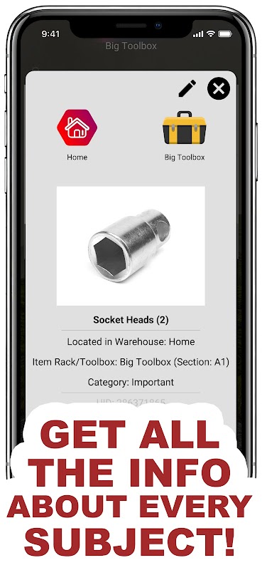 倉庫、自宅およびガレージの保管庫、ラック、棚、道具箱、クローゼット、冷蔵庫、アイテムを簡単かつ自然にアプリに追加します。