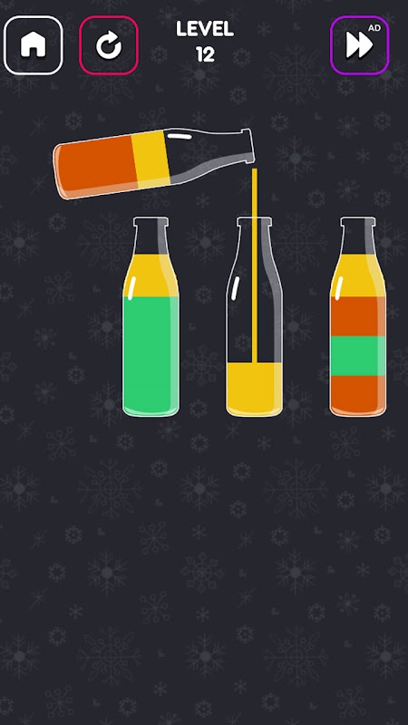 - カラーマッチゲームで各ボトルに同じ色の水をうまく配置すると、レベルに勝ち、次のレベルに移動します。