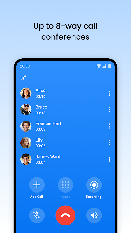 従来の通信事業者の8者通話は通常3者通話のみに対応していますが、We Callは最大8者までの多者通話機能に対応しているため、複数人での会議や家族の集まりなど、複数の親戚や友人と同時に音声通話を行うことができます。