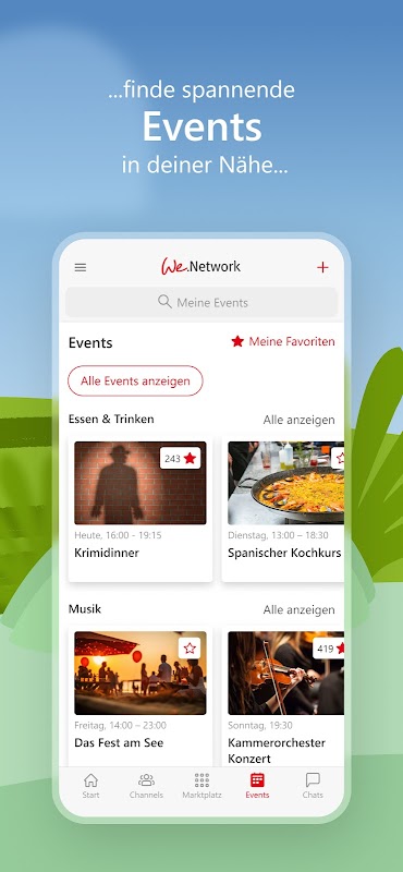 個人的な交換の場合は、グループに参加したり、暗号化された個別のチャットを開始したりできます。マーケットプレイスには、お客様の要件に合わせて We.Network を設計できるデジタル サービスが数多くあります。イベントエリアでは、さまざまなカテゴリで地元のイベントを見つけてお気に入りに追加できます。