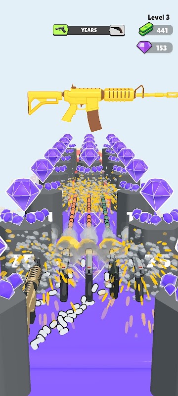 ウェポンドロップでは、プラットフォームを撃って様々な銃を落とすところからスタートします。できるだけ多くの武器を集め、各レベルの最後にそれらを並べることで、ダイヤモンドが敷き詰められたプラットフォームに破壊的な弾幕を放ちます。ゲームを進めていくと、貴重なダイヤモンドを集めてウォーアリーナに投資できます。ウォーアリーナでは兵士を募集・アップグレードして、無敵の軍隊を作り上げることができます。